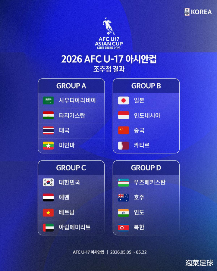 2、U17亚洲杯分组揭晓,韩国男队抽到好签
